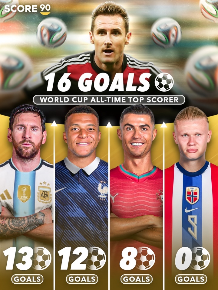 Cầu thủ ghi nhiều bàn thắng nhất trong lịch sử World Cup hiện nay là Klose. Anh ghi 16 bàn ở 4 kỳ World Cup tham dự cùng đội tuyển Đức, vượt qua Ronaldo, người ghi 15 bàn. Trong số những cầu thủ đang thi đấu tích cực, Messi đã ghi 13 bàn và Mbappe ghi 12 bàn có cơ hội vượt qua Klose ở World Cup năm sau. Tuy nhiên, Kane, Ronaldo và Neymar, những người đã ghi 8 bàn, sẽ gặp khó khăn hơn.