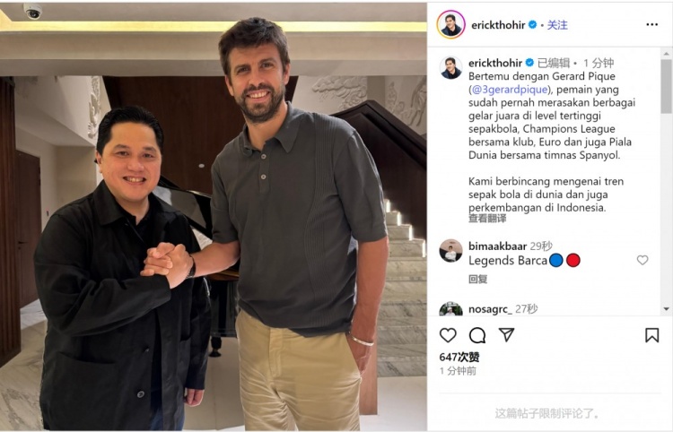 Chủ tịch Hiệp hội bóng đá Indonesia và cựu Chủ tịch Inter Milan Tohill đã cập nhật các bản cập nhật phương tiện truyền thông xã hội của mình và đăng một bức ảnh với Pique. {3 đưa